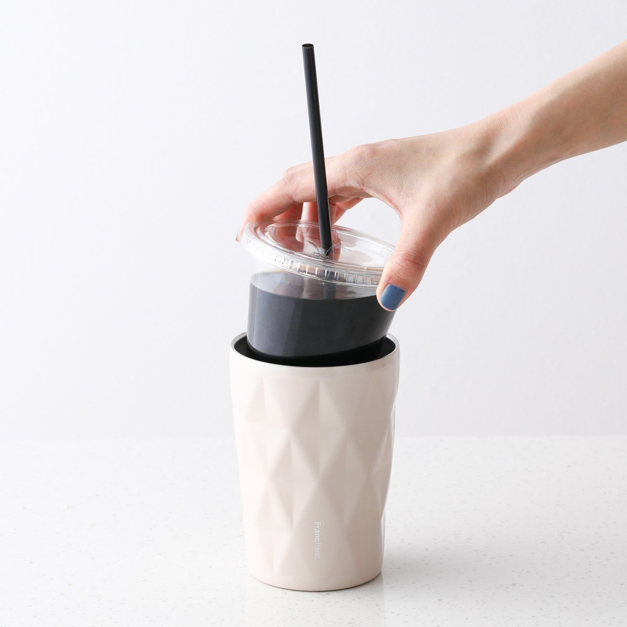 テイクアウトしたドリンクやコンビニコーヒーなどを、カップごと入れられる真空二重構造のステンレスカップに新柄登場です。