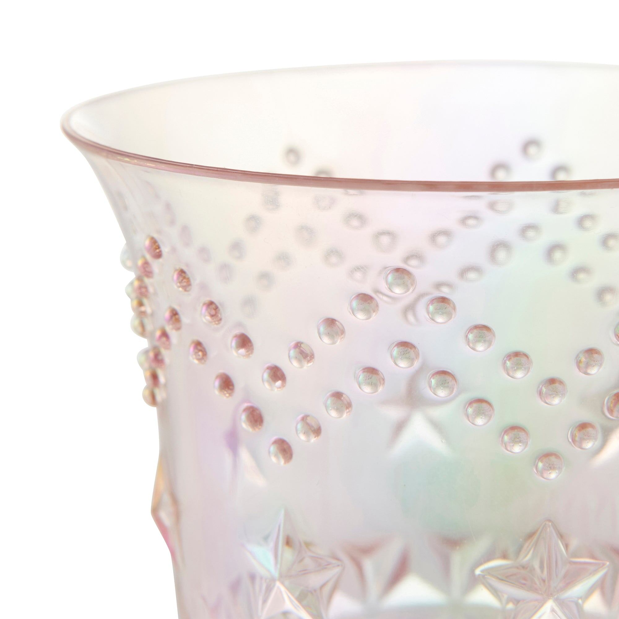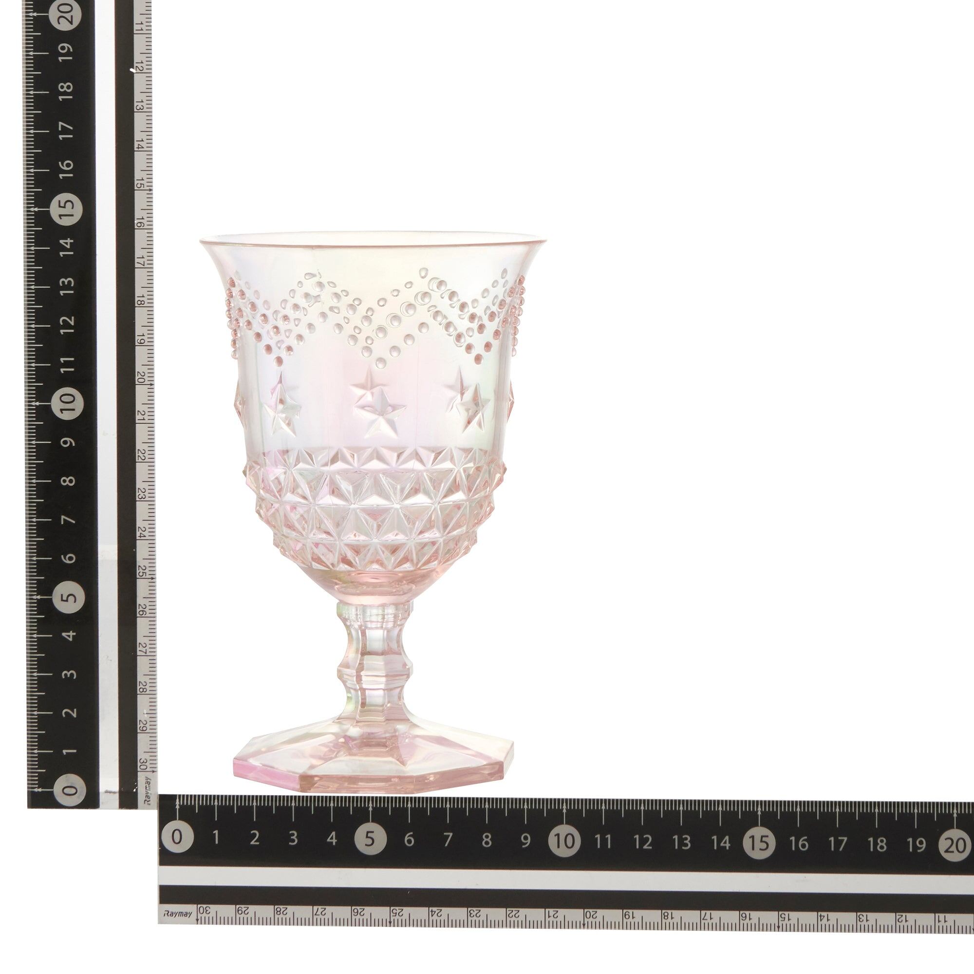 "カットされたデザインが美しいゴブレットの土台と脚の部分。 光に反射した面がピンクのオーロラのよう。"
