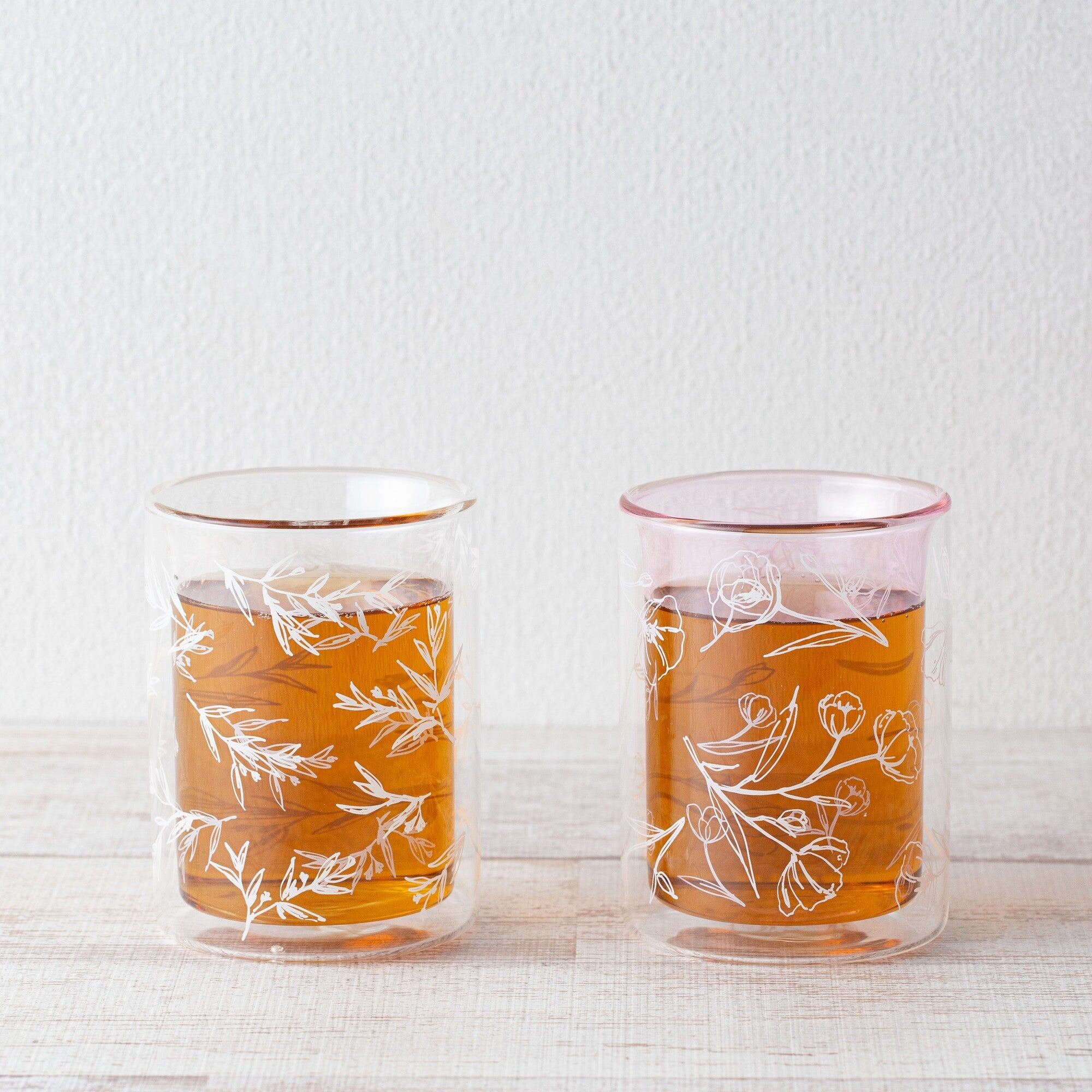 フラワーとリーフの柄がセットになったペアのダブルウォールグラスです。
