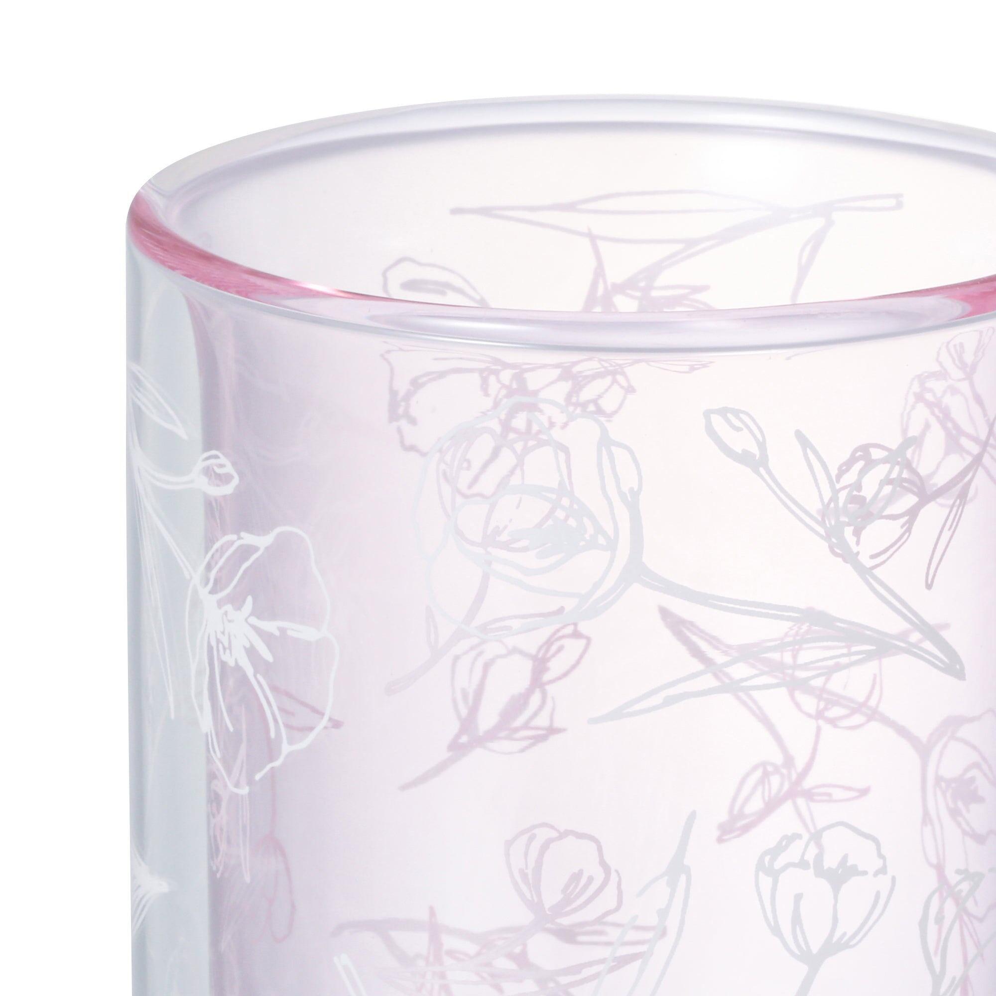 クリアのグラスにはリーフが。ピンクのグラスにはフラワーが描かれています。