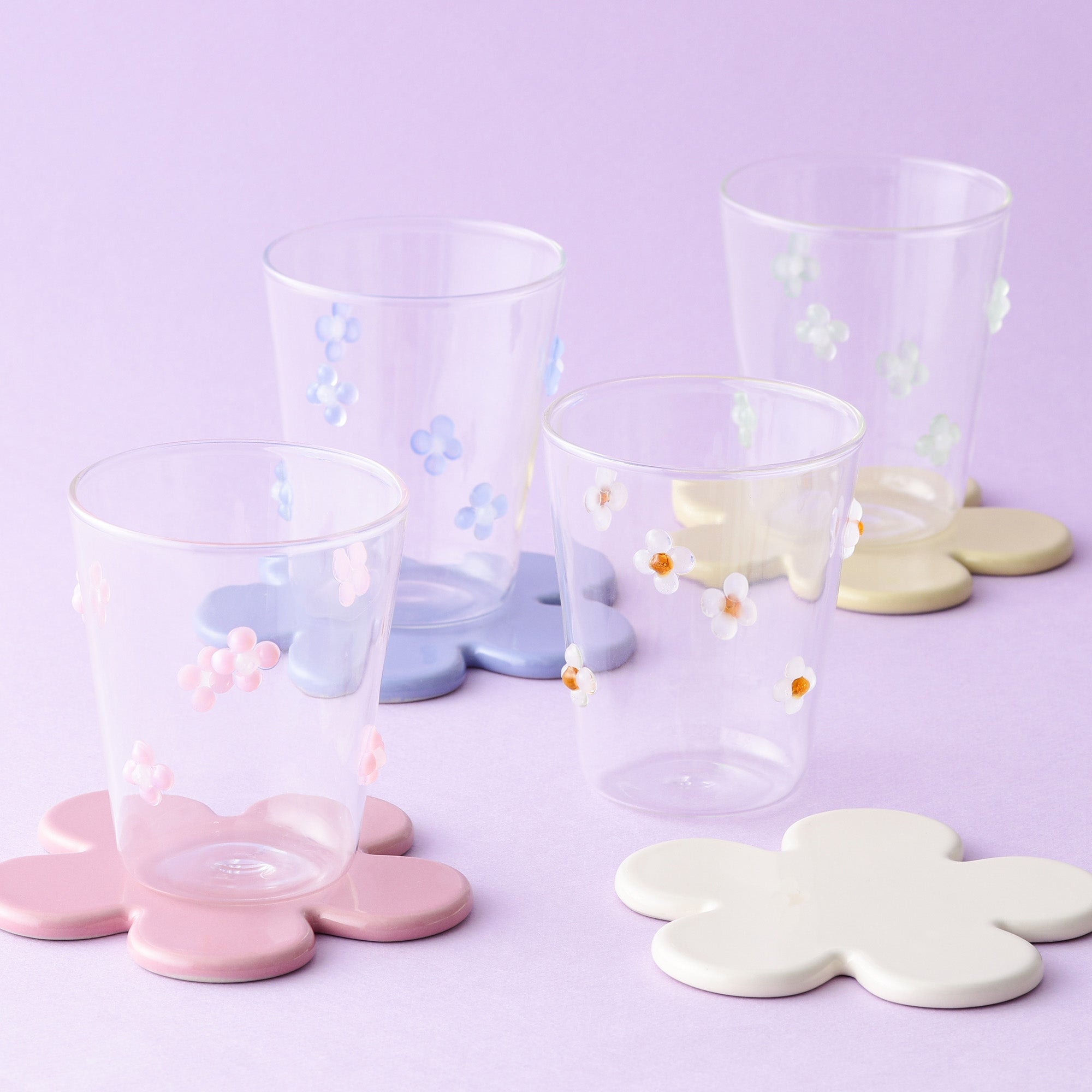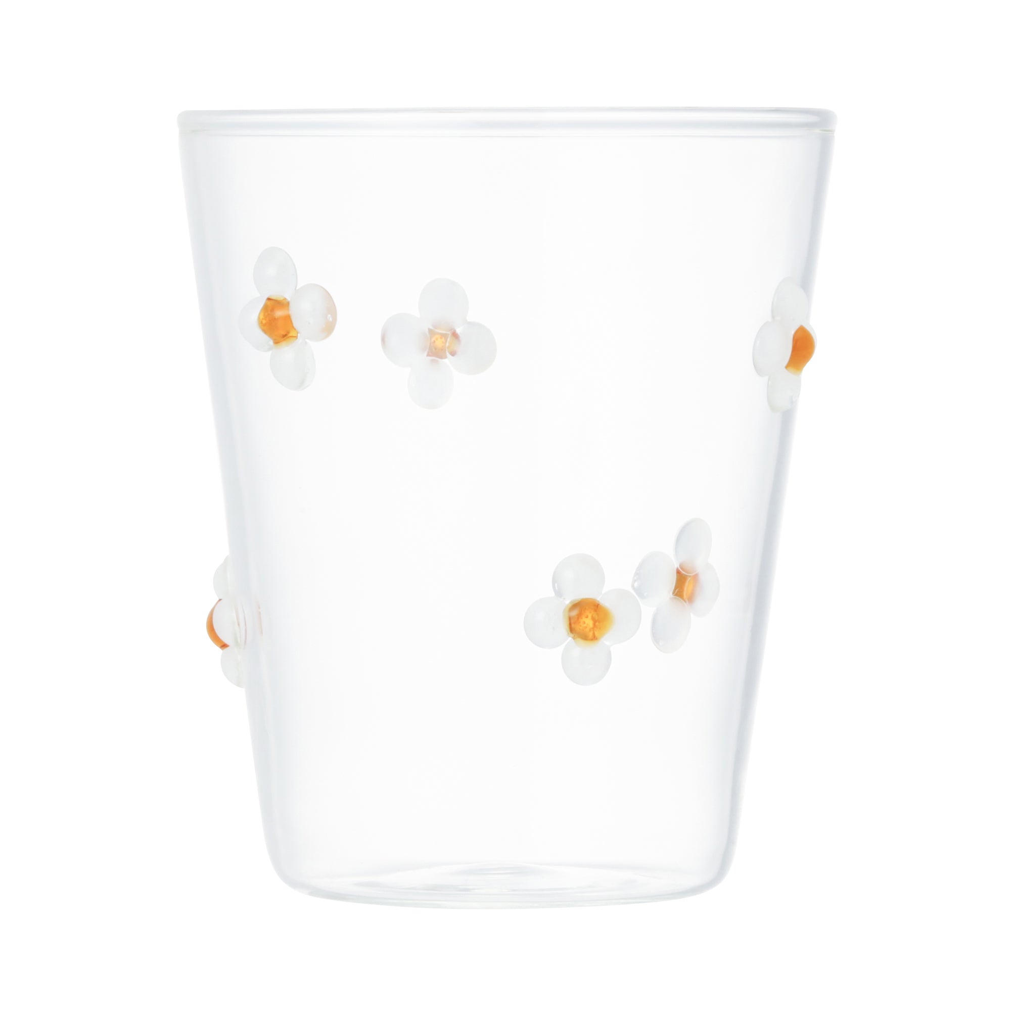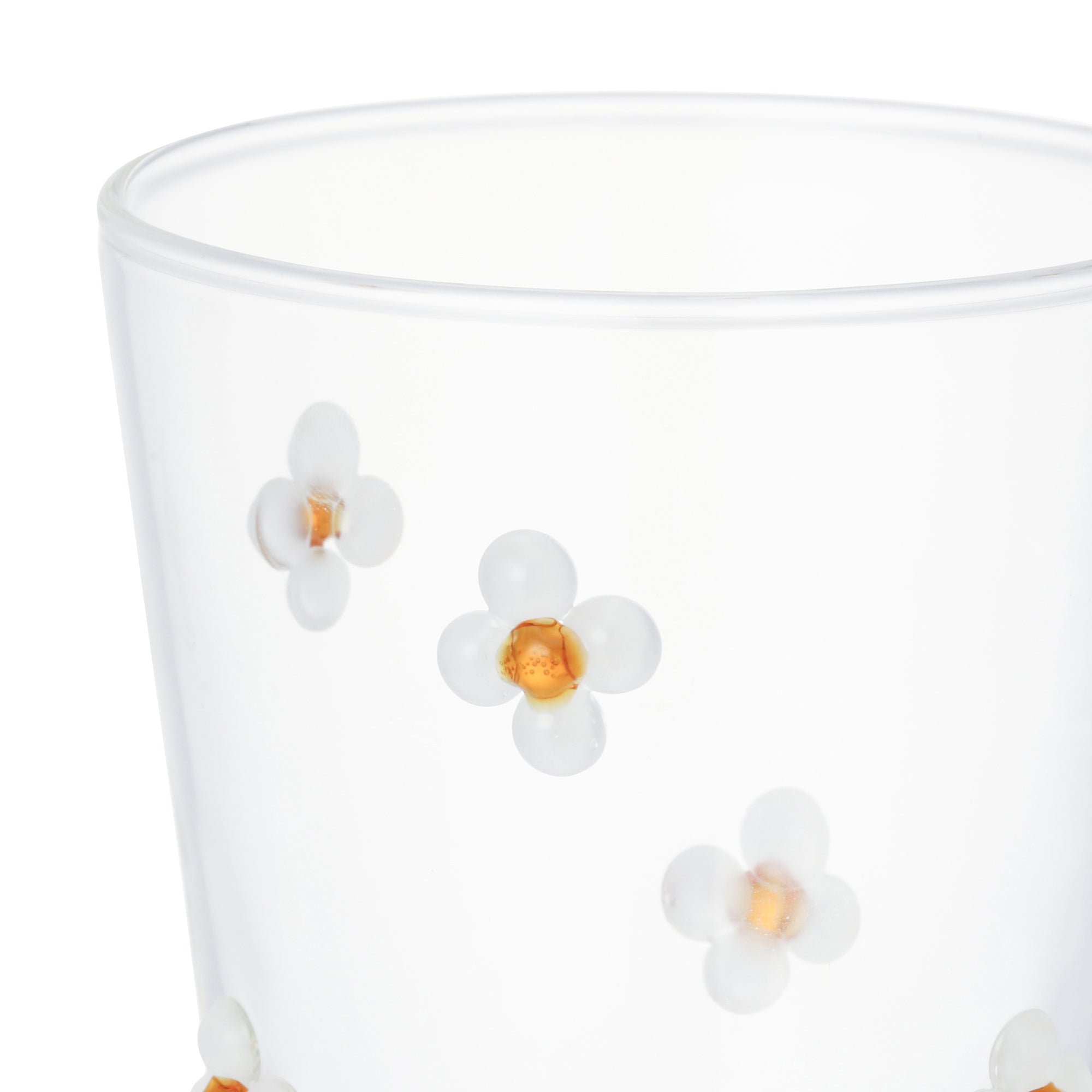ぷっくりしたお花のモチーフがちりばめられたシンプルなかたちのガラスタンブラーです。